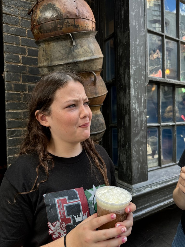 Afterward, we stopped for Butterbeer. Both the frozen and regular versions were a hit, but fair warning: it’s sweet!